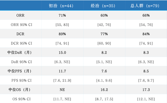 研究結(jié)果顯示,由盲態(tài)獨(dú)立影像評(píng)估委員會(huì)(BIRC)評(píng)估的總?cè)巳嚎陀^緩解率(ORR)為66%,初治患者ORR高達(dá)71%,經(jīng)治患者中ORR也達(dá)到60%;中位緩解持續(xù)時(shí)間(mDOR)總體人群為8.3個(gè)月,在初治和經(jīng)治患者中分別為15.0和8.2個(gè)月;起效迅速,中位起效時(shí)間為1.4個(gè)月,且大部分患者在第一次腫瘤評(píng)估時(shí)達(dá)到緩解。中位無(wú)進(jìn)展生存期(mPFS)總體人群8.5個(gè)月,初治和經(jīng)治患者分別為11.7個(gè)月和7.6個(gè)月;中位總生存期(mOS)總體人群17.3個(gè)月,其中初治患者尚未達(dá)到,經(jīng)治患者達(dá)16.2個(gè)月。