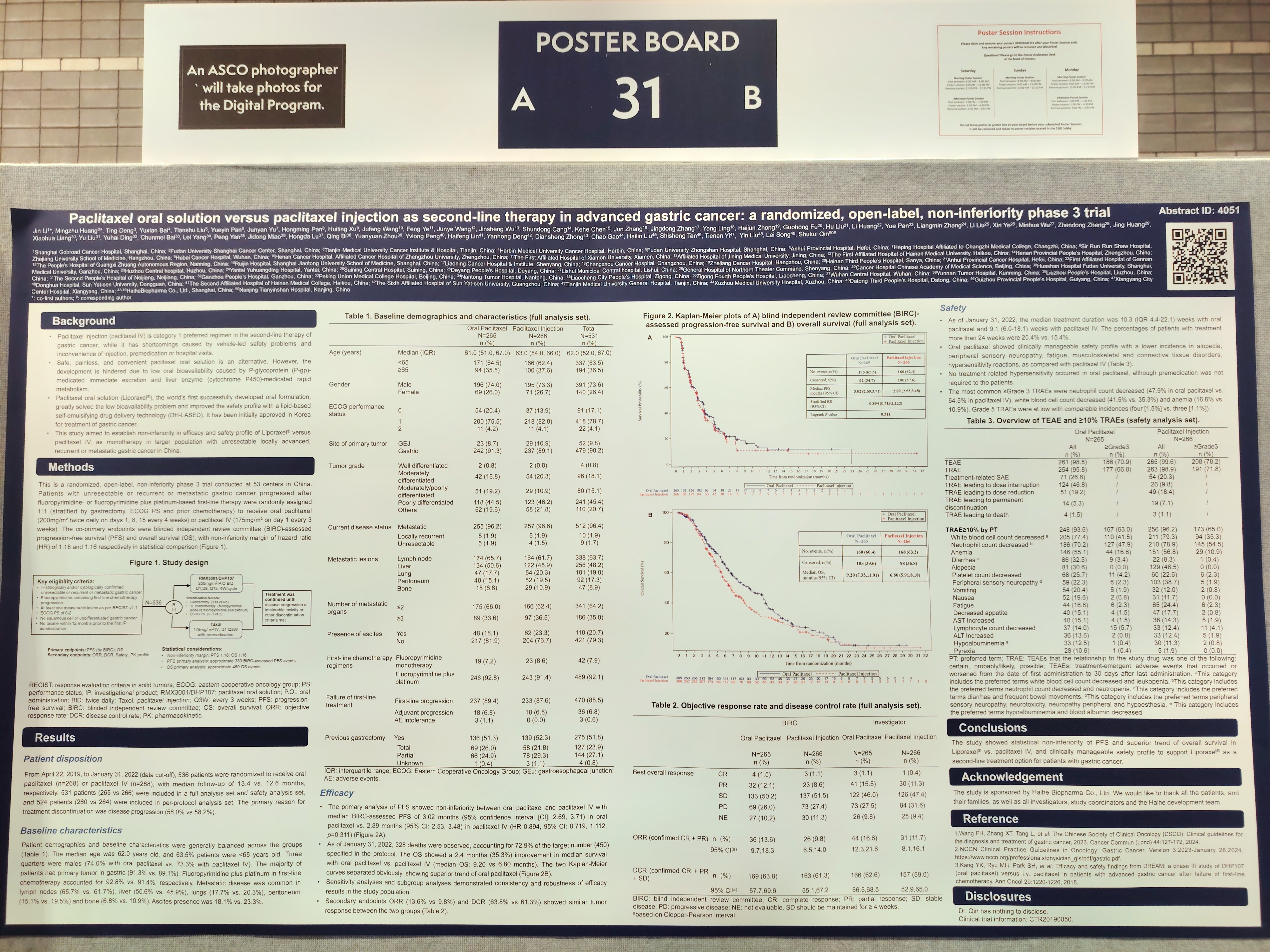 在此次ASCO年會(huì)中,我們報(bào)告了紫杉醇口服溶液對(duì)比紫杉醇注射液作為單藥治療在經(jīng)一線含氟尿嘧啶類(lèi)方案(單藥或與鉑類(lèi)聯(lián)合)治療失敗的不可手術(shù)切除、復(fù)發(fā)或轉(zhuǎn)移性中國(guó)胃癌患者中的有效性和安全性。這是一項(xiàng)隨機(jī)、開(kāi)放標(biāo)簽、非劣效設(shè)計(jì)III期臨床試驗(yàn),主要終點(diǎn)為基于盲態(tài)獨(dú)立閱片委員會(huì)(BIRC)評(píng)估的無(wú)進(jìn)展生存期(PFS)和總生存期(OS)。