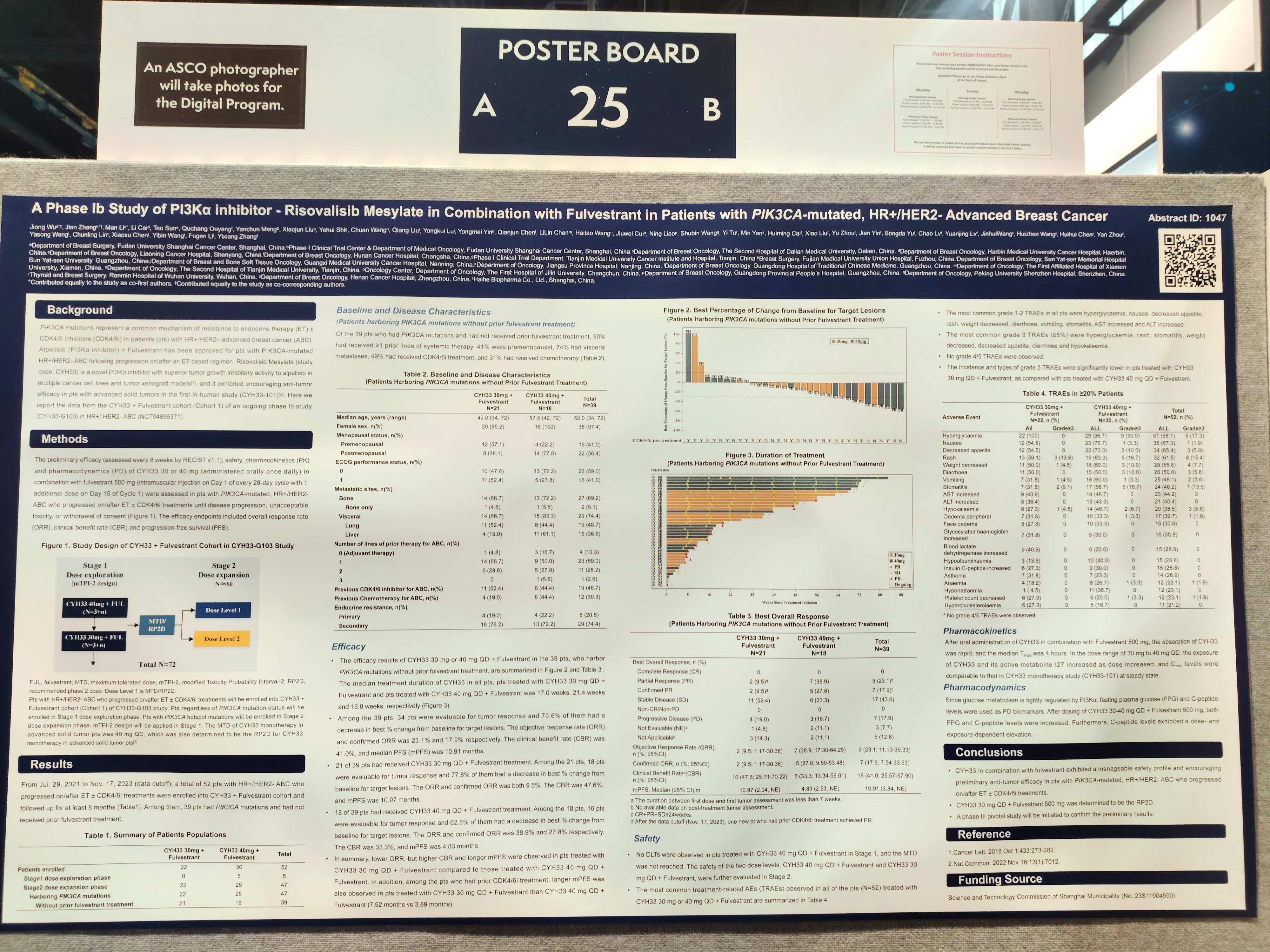 PIK3CA突變是HR+/HER2-晚期乳腺癌患者對(duì)內(nèi)分泌±CDK4/6抑制劑治療產(chǎn)生耐藥的常見(jiàn)機(jī)制之一。甲磺酸瑞索利塞片(研究代號(hào):CYH33)是一種新型PI3Kα抑制劑,在多種腫瘤細(xì)胞系和異種移植瘤模型中具有優(yōu)異的腫瘤生長(zhǎng)抑制活性,并在晚期實(shí)體瘤患者(基于CYH33單藥I期臨床研究CYH33-101研究)中展現(xiàn)出良好的抗腫瘤活性。在此次ASCO年會(huì)中,我們報(bào)告了一項(xiàng)正在HR+/HER2-晚期乳腺癌患者中進(jìn)行的Ib期研究(CYH33-G103)中CYH33+氟維司群隊(duì)列的數(shù)據(jù)。