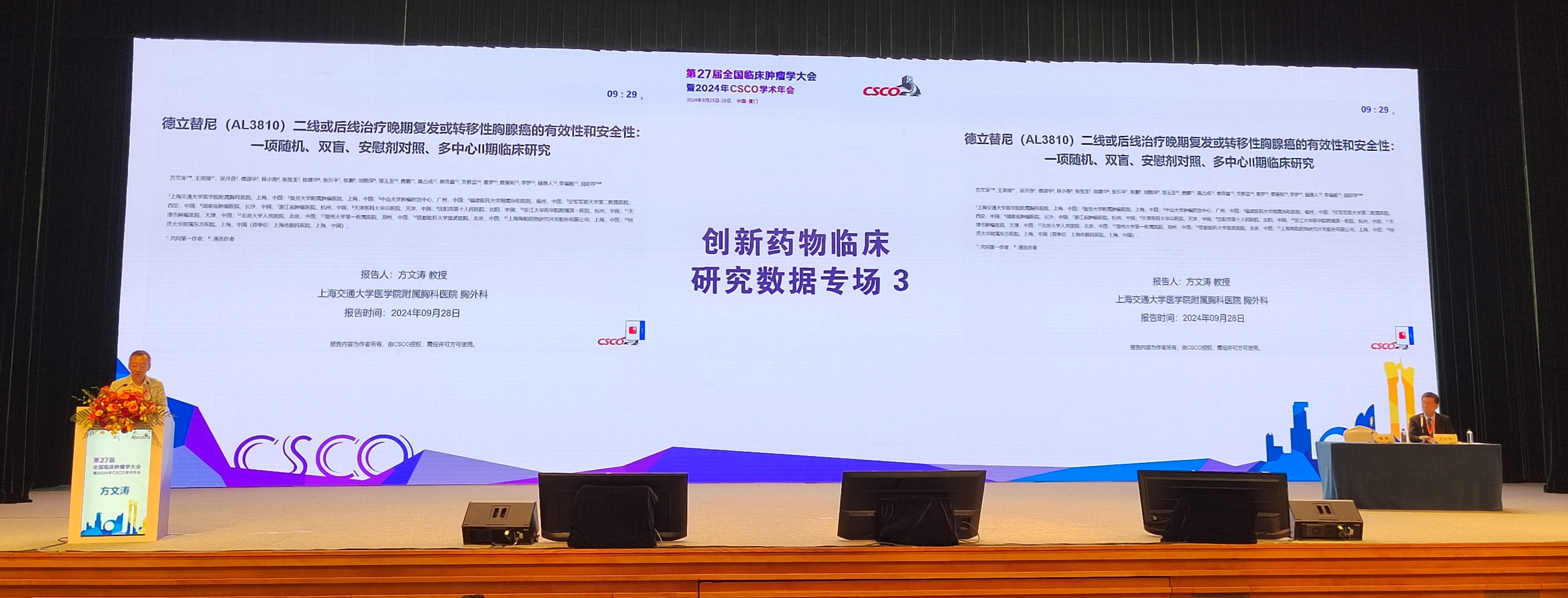 晚期復(fù)發(fā)或轉(zhuǎn)移性胸腺癌患者在化療經(jīng)治失敗后,治療選擇十分有限。德立替尼(AL3810)是一種口服強(qiáng)效、高選擇性作用于VEGFR1–3、FGFR1-3和PDGFRα/β的三靶點(diǎn)酪氨酸激酶抑制劑。在此次CSCO年會(huì)中,我們報(bào)告了由上海交通大學(xué)醫(yī)學(xué)院附屬胸科醫(yī)院方文濤教授團(tuán)隊(duì)和同濟(jì)大學(xué)附屬東方醫(yī)院(原單位:上海市肺科醫(yī)院)周彩存教授團(tuán)隊(duì)領(lǐng)銜的在既往至少接受過一線化療失敗的晚期復(fù)發(fā)或轉(zhuǎn)移性胸腺癌患者中的迄今全球第一個(gè)隨機(jī)、雙盲、安慰劑對(duì)照臨床試驗(yàn)(AL3810-202)的研究結(jié)果。